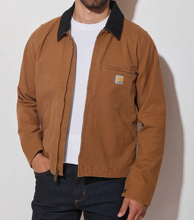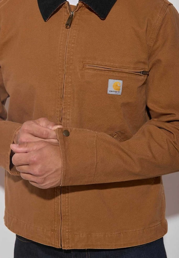 - Kultowy styl Detroit Jacket – krótki krój, kontrastowy kołnierz (z sztruksu), metalowy zamek i charakterystyczne naszywki Carhartt nadają kurtce klasyczny, roboczo-miejski charakter.