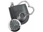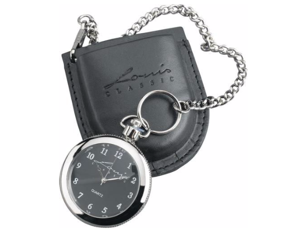 Zegarek kieszonkowy na łańcuszku z etui skórzanym. Produkcja renomowanej firmy Louis.